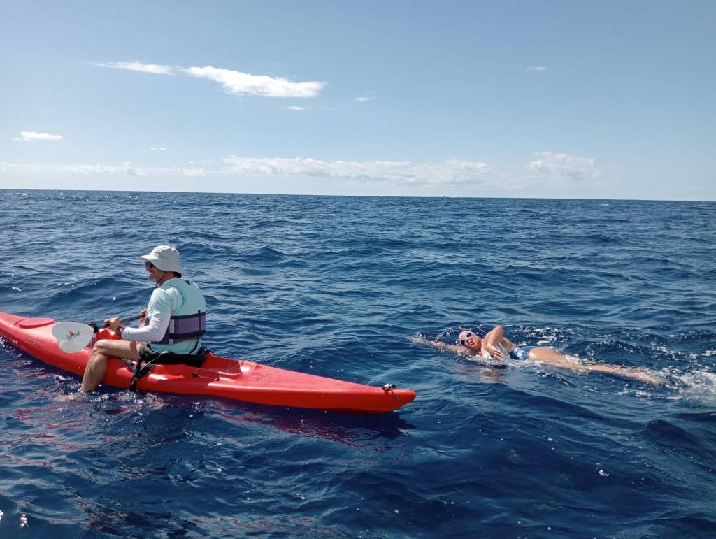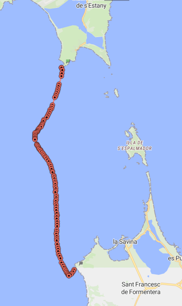 Dieses Bild zeigt den Morgen an dem wir uns am Salinas Beach trafen um mit dem Boot zu einem Felsen (Cap des Falco) zu fahren wo der eigentliche Startpunkt lag. Gefahren wurde das Boot von Juanjos Frau Bea., ebenso an Bord war Inma, eine Rettungsschwimmerin die bei Bedarf medizinische Erstversorgung leisten konnte. Bei deren Anfahrt zum Treffpunkt am Strand wurde klar in welche Richtung es geht, ich sollte also von Ibzia nach Formentera schwimmen. Das Meer war ruhig, ich eher nervös. Trotzdem konnte ich es kaum erwarten endlich loszulegen. So sprang ich gegen 8.30 Uhr in warmes, weiches und sehr salziges Wasser und begann zu schwimmen. Zu Beginn ging das ganz prima, es gab kaum Bewegung im Wasser so dass ich gut voran kam. Auch die Verpflegung klappte und ich fühlte mich gut. Doch bald wurde das Wasser unruhig und konfus, bis hin zu Wellen die mich stark herausforderten. Ich habe zwar im Fluss gegen die Strömung trainiert, aber Wellen gab es da natürlich nicht. Auch meine Trainings in Bahrain und Spanien waren nicht mit diesen Bedingungen vergleichbar, ich musst kämpfen. Juanjo mit seinem roten Kajak, immer an meiner Seite, war mir eine große Hilfe.